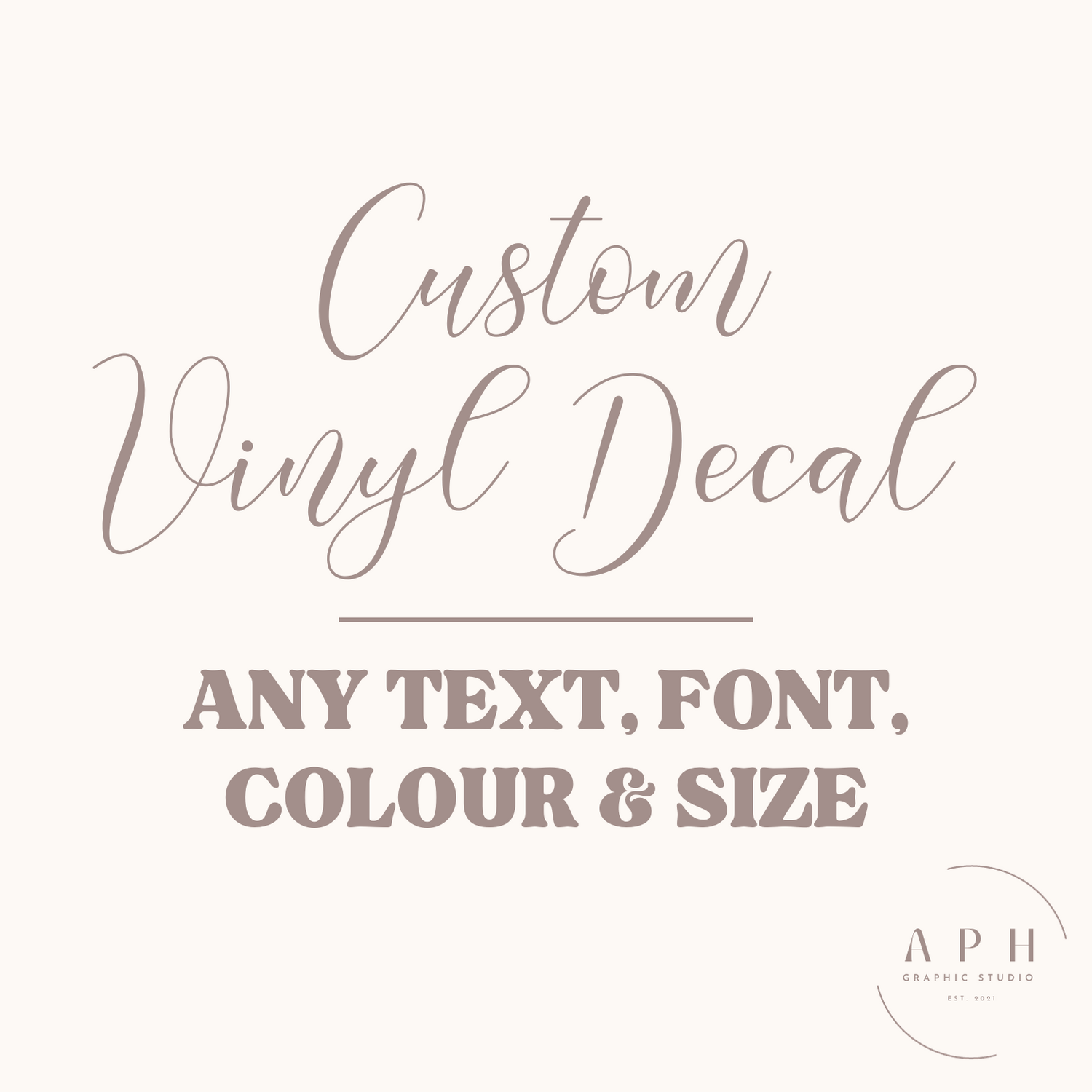 CREATE YOUR OWN CUSTOM DECAL BY CHOOSING FONT, SIZE, COLOUR AND TEXT. RANGING FROM 6CM - A4 SIZING. IF YOU REQUIRE A BIGGER SIZE FOR YOUR PROJECT PLEASE EMAIL US - HELLO@APHGRAPHICSTUDIO.COM