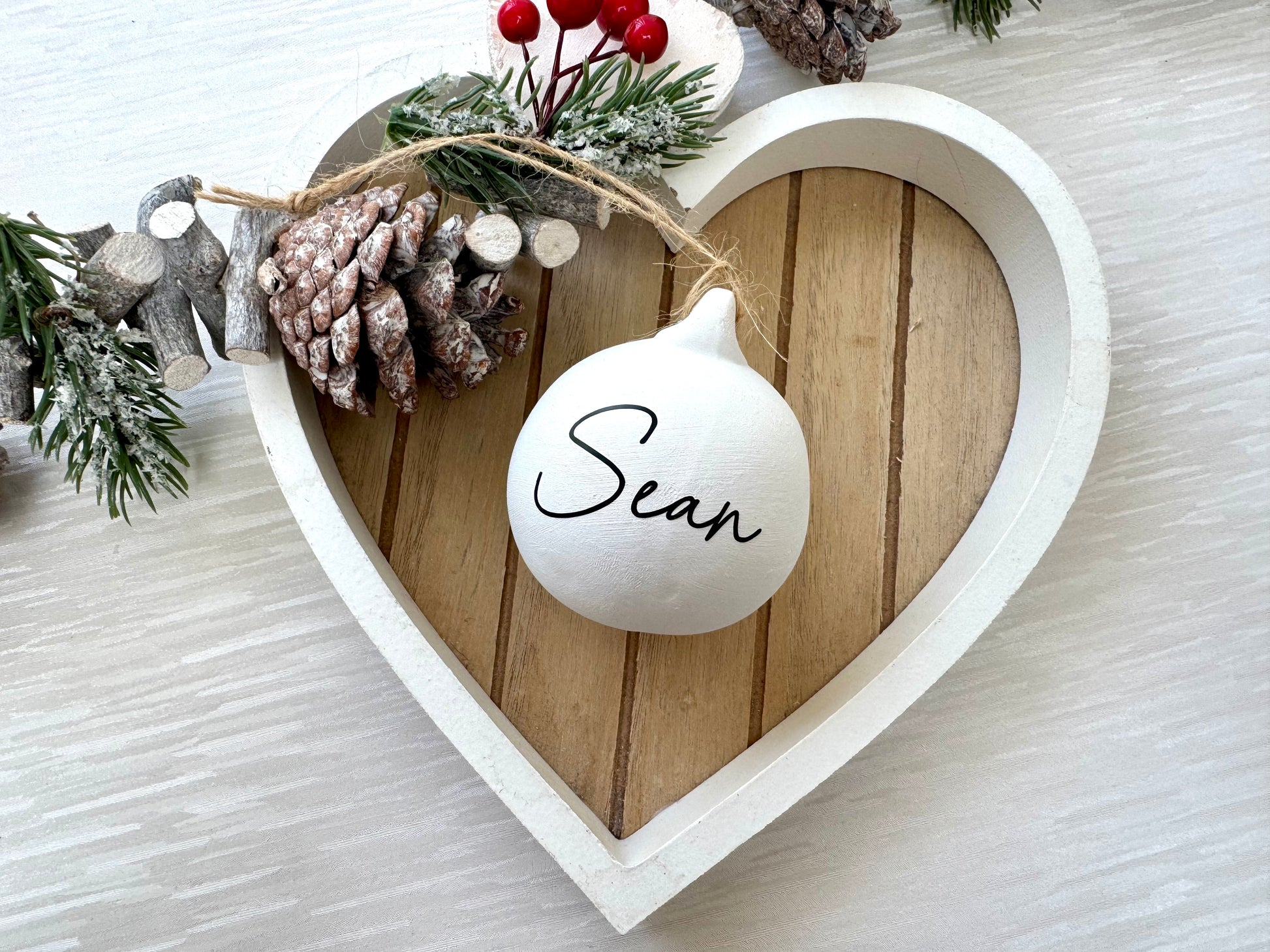 Create your own Christmas bauble in our handwritten font. Perfect for adding a personalised touch to your Christmas tree, a stocking filler or Secret Santa gift.