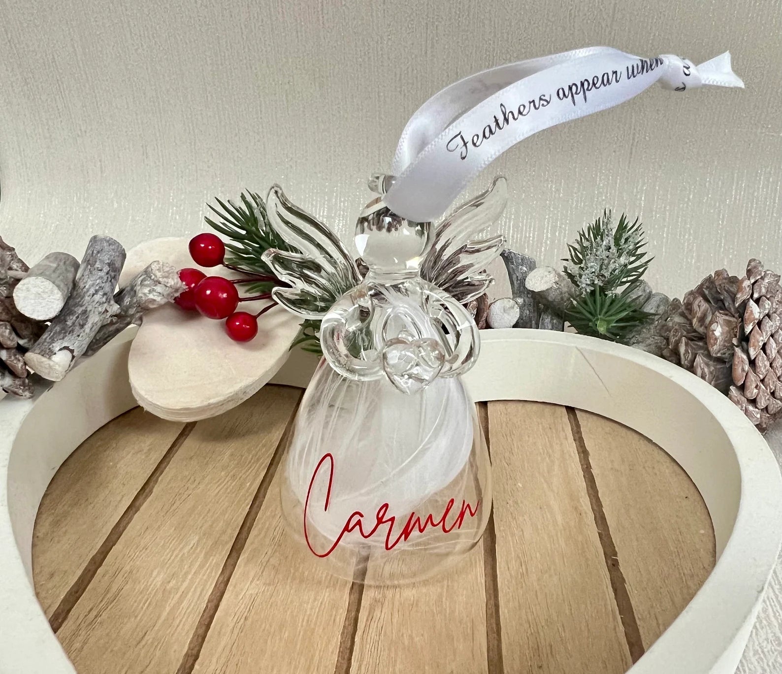 • A delicate feather within a glass Angel complete with 'feathers are near when angels appear' ribbon, personalised with a name of your choice.
